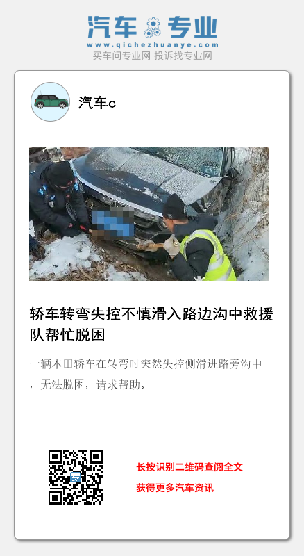 据本田车驾驶员讲,当时车辆是在两利乡由北向南准备回张子滨屯,当车行驶至张子滨屯北侧时,因路遇急弯,路面结冰光滑,车速过快,车辆翻进路旁沟中,驾驶员从副驾驶钻出车辆自救,但车子困在沟中,没办法只好求助救援队。