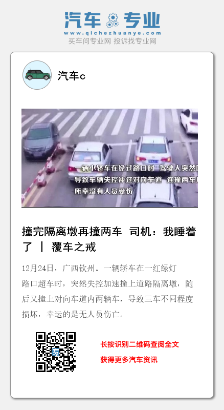 12月24日,广西钦州。一辆轿车在一红绿灯路口超车时,突然失控加速撞上道路隔离墩,随后又撞上对向车道内两辆车,导致三车不同程度损坏,幸运的是无人员伤亡。
