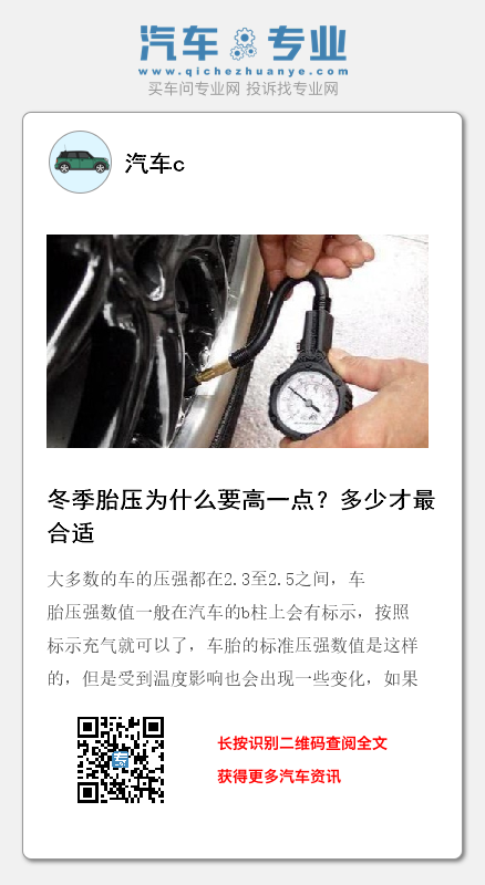 冬天的时候推荐使用比标准高10~15%的充气压力,冬天车胎压强调到多少合适呢?有人说是2.3,有人认为是2.5,冬季由于气温比较低,受热胀冷缩的影响,我们的车胎胎压也会发生变化,一般来说车胎压强的正常范围在2.5左右,平时我们可以这样调,但进入冬季之后车胎胎压就要调高一些,一般来说调到2.6才是最合适,最安全的,但不能超过规定的最大充气压力。如果车主平时出行的时候车上人员比较多,经常满载,这种情况下车胎胎压也可以适量调低一些,总的来说,车胎的胎压还是要视情况而定,我们要定期去为车子做检查,确保车况良好,也能保障车主的行车安全。