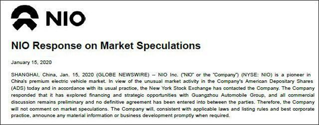 受上述消息刺激,蔚来1月15日盘前涨超17%,盘中暴涨近19%并触发盘中熔断,导致其在纽交所暂停交易,并因此引发纽交所问询。随后,蔚来汽车回应纽交所称,公司与广汽探讨了融资和战略机遇,谈判处于初步阶段,双方尚未达成最终协议。