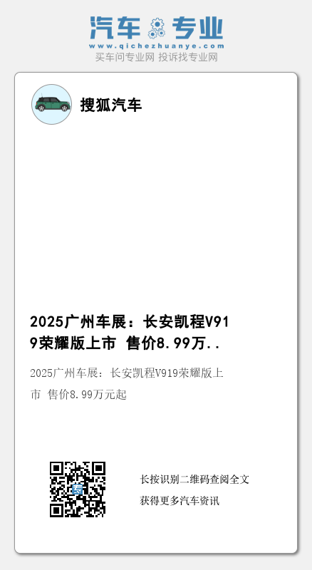 2025广州车展于今日开幕,长安凯程V919(图片|配置|询价)荣耀版正式上市,指导价8.99万元起。长安凯程V919基于原生新能源数智架构K01打造,定位电动轻客,将提供长/短轴、高/低顶不同组合的车身形式供选择,新车具有方正大空间、后驱大承载、超低电耗、超前设计、智慧生态五大看点。