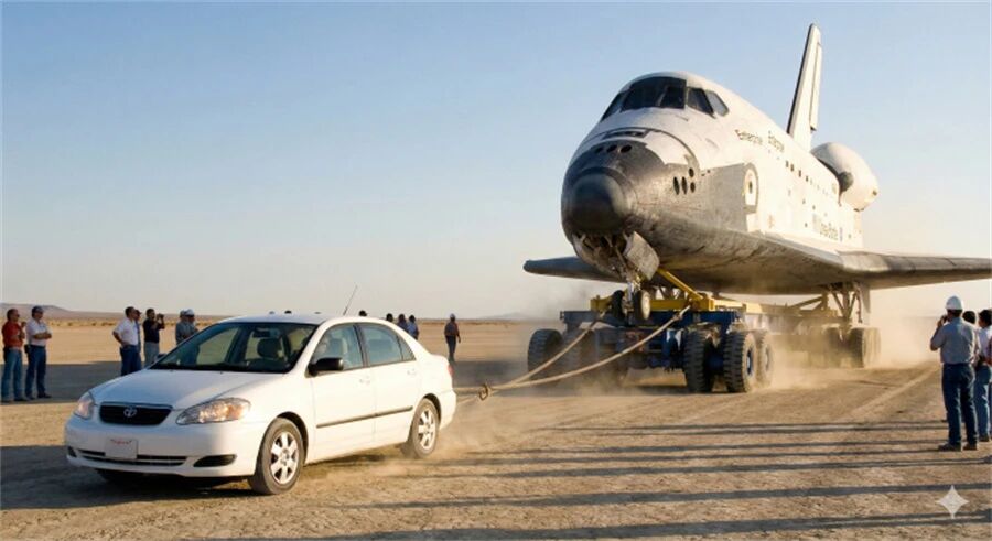 但只要你还没把初中物理还给老师,你就会明白这纯属“降智表演”。飞机沉重是不假,但它有轮子啊!车子克服的是滚动摩擦力,而不是要把飞机垂直提起来。只要轮胎不打滑,地面抓地力够大,即便是一辆普通的丰田卡罗拉,也能在平地上把150吨的航天飞机拉着走。