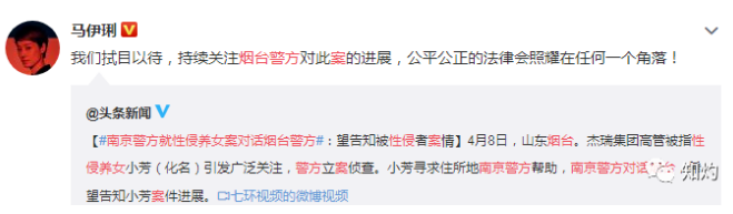 演员马伊琍在转发南京警方与烟台警方对话后说:持续关注烟台警方对此案的进展,公平公正的法律会照耀在任何一个角落!