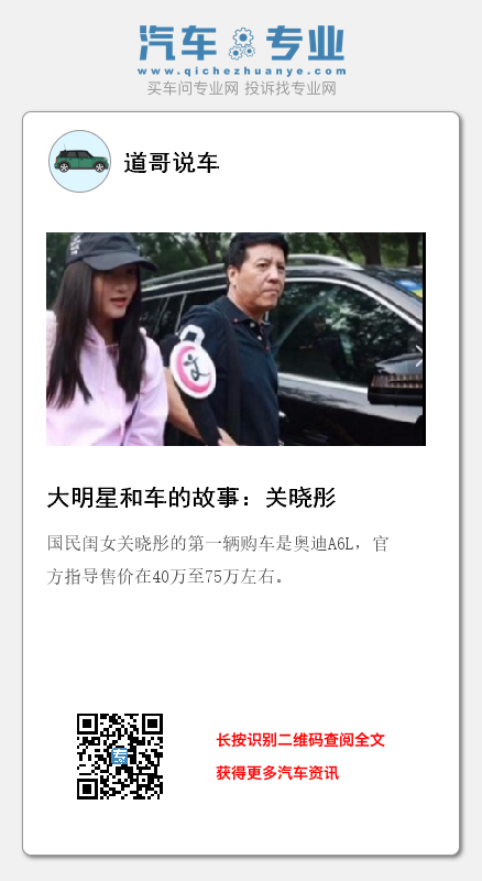 国民闺女关晓彤的第一辆购车是奥迪A6L,官方指导售价在40万至75万左右。