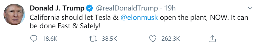 马斯克此举得到了加州州长加文-纽森和美国总统特朗普等人的支持。特朗普周二发推,敦促加州允许特斯拉工厂恢复生产。特朗普称:「加州应该让特斯拉和埃隆-马斯克开放工厂,现在。这可以迅速并安全地做到!」