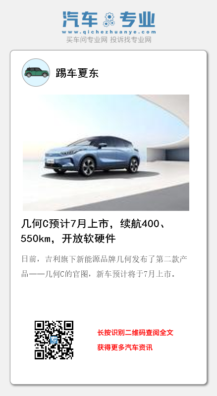 日前,吉利旗下新能源品牌几何发布了第二款产品——几何C的官图,新车预计将于7月上市。