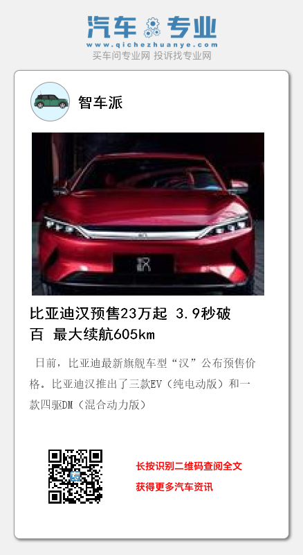 日前,比亚迪最新旗舰车型“汉”公布预售价格。比亚迪汉推出了三款EV(纯电动版)和一款四驱DM(混合动力版),在全国综合补贴后,DM四驱性能版豪华型售价23万,EV超长续航版豪华型售价24万、EV超长续航版尊贵型售价26万、EV四驱高性能版旗舰型售价28万。