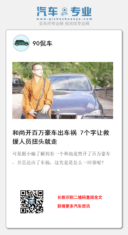 短短的7个字,一时竟让救援队语塞,虽然还是很怀疑,但是本着人道主义精神,救援队依旧继续营救着和尚,可是在他们营救过程中,却发现这辆豪车原来是私自改装的,刹车系统和动力系统完全偏离了正常标准,所以才最终导致刹车系统失灵,发生了车祸。