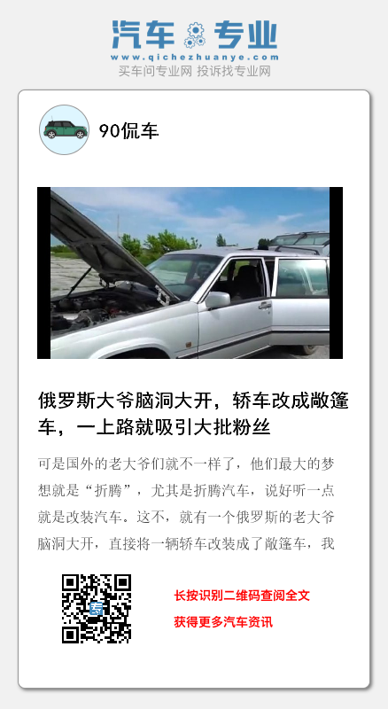 在我们的印象中,当一个人步入老年之后,就会出去遛遛弯儿,看看孙子,没事的话,就去广场上跳一段广场舞,生活过得非常的安逸。这是国内绝大多数老年人的生活,可是国外的老大爷们就不一样了,他们最大的梦想就是“折腾”,尤其是折腾汽车,说好听一点就是改装汽车。这不,就有一个俄罗斯的老大爷脑洞大开,直接将一辆轿车改装成了敞篷车,我们一起看一下。