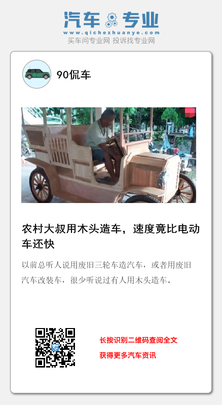 生活中缺的不是敢想的人,而是敢做的人,只要大家敢于实践,很多东西都能从构思变成实物。我国农村有很多能人巧匠,这些人的双手特别灵活,能够用生活中一切随处可见的东西造车。以前总听人说用废旧三轮车造汽车,或者用废旧汽车改装车,很少听说过有人用木头造车。