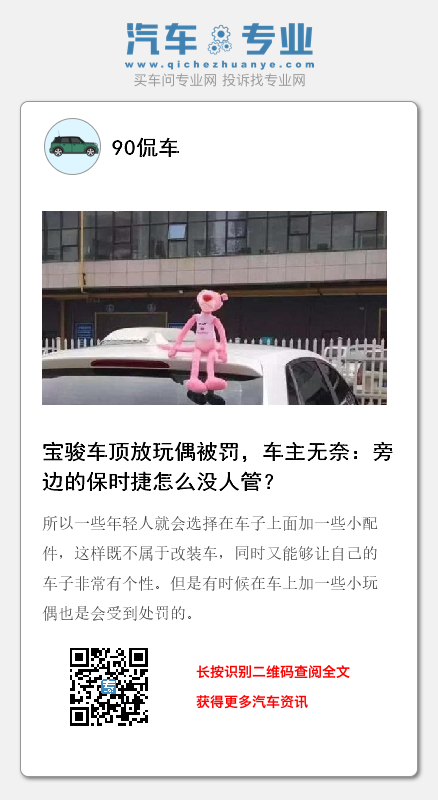 车主小张拥有一辆宝骏汽车,年轻的小张为了让自己的车子看起来更有特点,就在车顶安装了一个体积比较小的玩偶。在他看来自己只是在车上放了一个玩偶,并没有改装车子,所以这种行为并没有违反交通规则。但是让他没想到的是,他开着这辆宝骏上路的第一天,就因为这个玩偶被交警罚款。对于这件事情小张表示非常不能接受,他问交警旁边那辆放着7个葫芦娃的保时捷为什么不管?