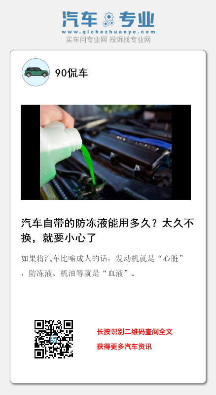 前段时间有一位车友问了一个问题,他刚买新车不久,汽车内有自带的防冻液,那么这种防冻液可以用多久呢?相信有很多车主都不知道,等到发动机爆缸的时候就晚了。新车内加入了多少防冻液跟厂家有关,品质好不好决定了使用期限和更换周期。一般自带防冻液的品质都很好,可以使用很长一段时间。